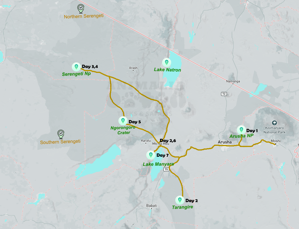 Embark on an unforgettable seven-day guided tour, ideal for your first safari experience. Discover the breathtaking beauty of African landscapes, from the majestic Serengeti National Park to the awe-inspiring Ngorongoro Crater, as well as hidden gems like Arusha and Lake Manyara National Park. From the moment you begin, immerse yourself in the splendor of nature – vast skies, diverse wildlife, and vibrant flora await you at every turn. Encounter lions up close, witness the mesmerizing sight of flamingos on a soda lake, learn to spot submerged hippos, and marvel at the countless species of birds that fill the air. With comfortable camps, delicious cuisine, and a knowledgeable, friendly guide by your side, this seven-day Tanzanian safari promises to be the ultimate nature experience you’ve been dreaming of.