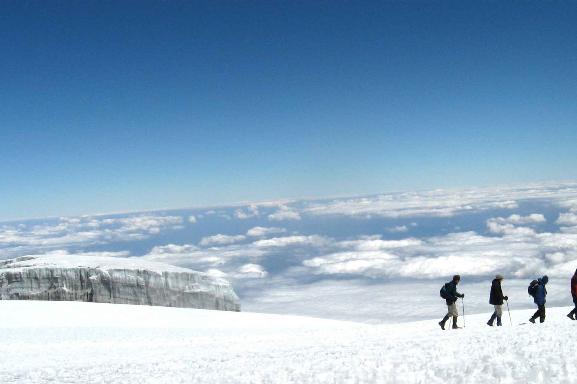 You will be awoken around 11:30 with hot tea and biscuits and will then begin the steep incline up the slopes of Kibo under the cover of darkness. Your first check-point is Hans Meyer Cave where you will take a short break. The climb steepens as you approach Gilman’s Point (5,681 meters), which will be around 5-6 hours after departing School Hut. Take a moment to enjoy the approaching dawn and incredible view out and across to Mawenzi Peak, but remember you still have 2 hours trekking to reach Uhuru Peak so dig deep for the energy. The slope flattens as you head west around the crater rim and you should arrive at the summit at or just after sunrise. Your stay here will be brief so get as many pictures as you can of the incredible views and surrounding glaciers.
